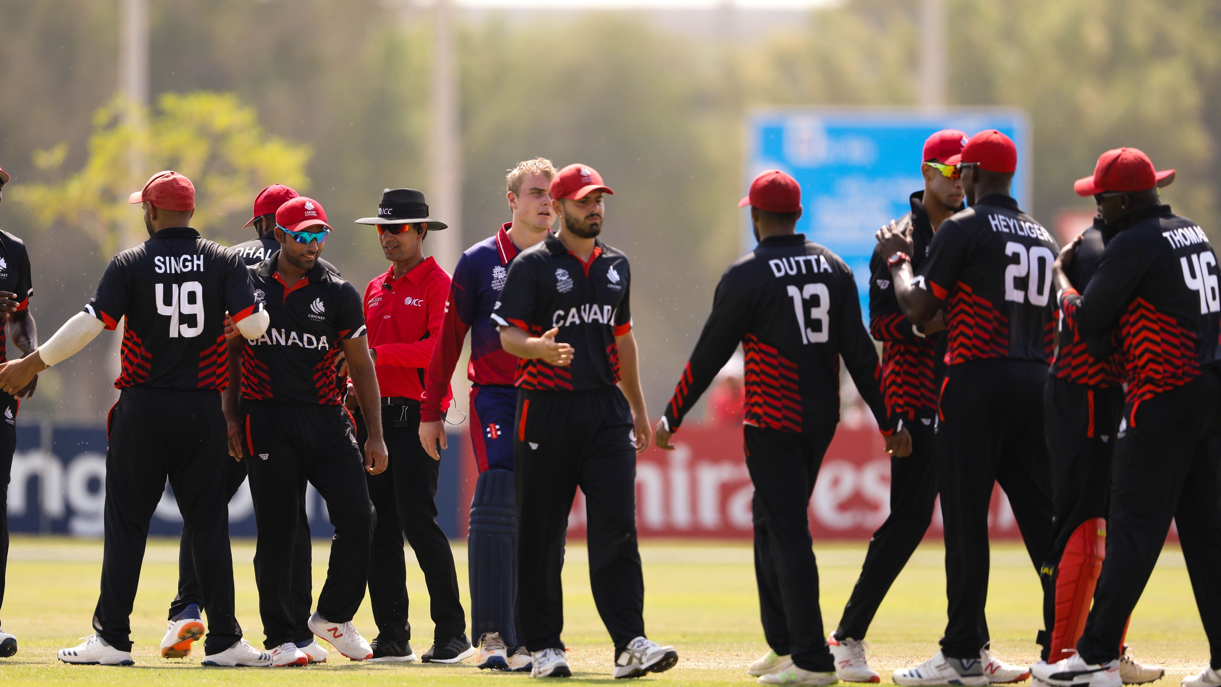 Having won the toss and inserted Canada on a sweltering Sunday morning in Abu Dhabi, Jersey skipper Charles Perchard needed his bowlers to back him up. And while they managed to keep the usually aggressive Rodrigo Thomas quiet, Perchard’s opposite number Navneet Dhaliwal hummed along fluently for 36 (26). Picking up regular boundaries and thumping a maximum off Dominic Blampied’s legspin, Dhaliwal looked dangerous before both openers fell within 3 deliveries – seamer Julius Sumerauer castling the laboured Thomas for 13 (22) and legspinning allrounder Ben Ward getting Dhaliwal caught by Greenwood.